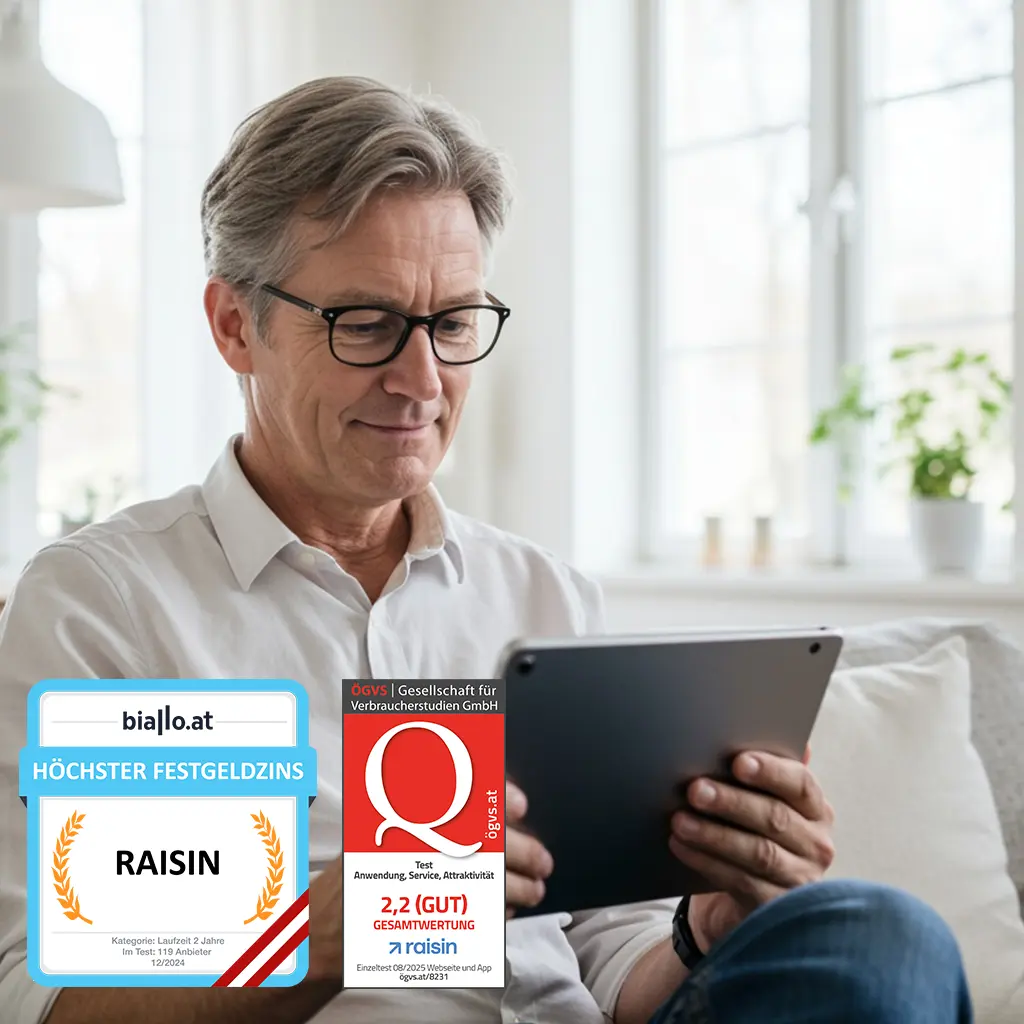Raisin ermöglicht einen einfachen Zugang zu ausgewählten europäischen Banken mit attraktiven Zinssätzen für Tages- und Festgeldkonten. Die einmalige Identifizierung erfolgt bequem online per VideoIdent. Raisin übernimmt die Eröffnung der Konten in Österreich oder im Ausland und bietet ein transparentes Onlinebanking. Mit nur einem einzigen Konto können mehrere Tages-, Flex- und Festgeldkonten eröffnet werden. Alle Einlagen können übersichtlich im Onlinebanking eingesehen und verwaltet werden.