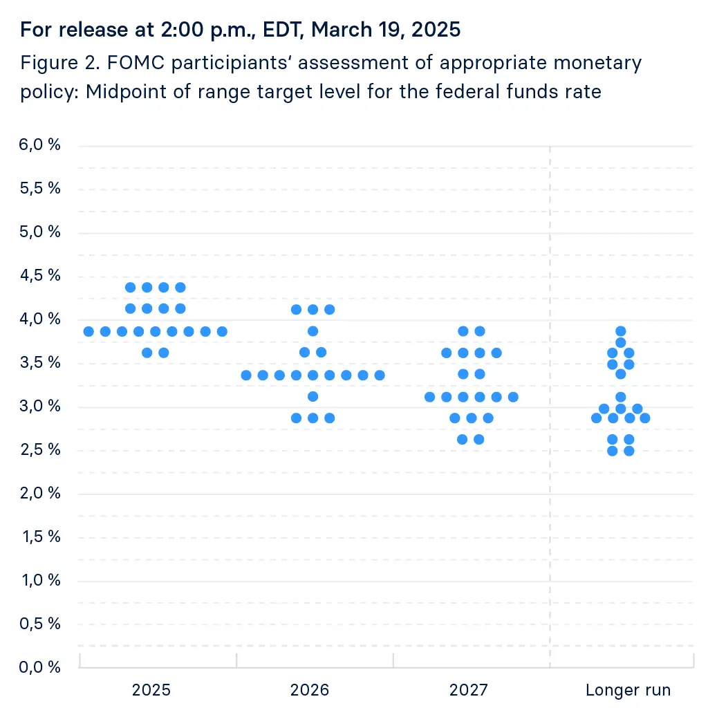 Elke Fed-functionaris deelt diens verwachting van het rentetarief. Dit wordt door middel van stippen (dots) in een grafiek weergegeven. Tijdens de FOMC-vergadering in juni 2025 werd de nieuwe Fed dot plot grafiek uitgebracht, die laat zien dat de renteverlagingen in 2025 minder groot zullen zijn dan eerder verwacht. Er wordt enige verdere verlaging van de rente verwacht in 2026, maar daarna denken veel beleidsmakers dat de rente stabiel zal blijven.